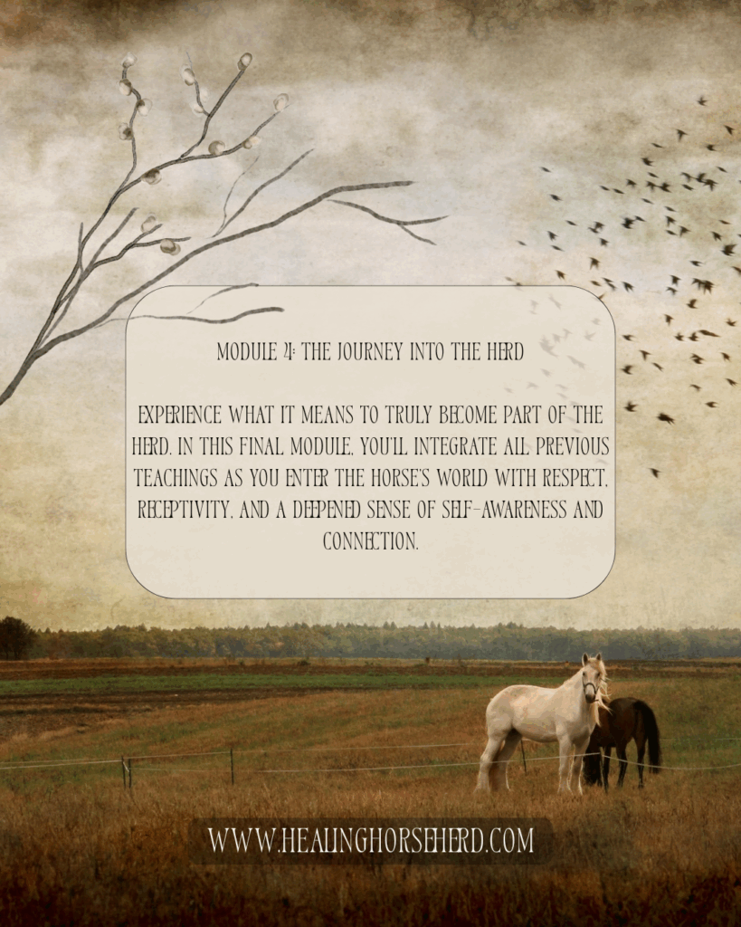 Experience what it means to truly become part of the herd. In this final module, you’ll integrate all previous teachings as you enter the horse’s world with respect, receptivity, and a deepened sense of self-awareness and connection.